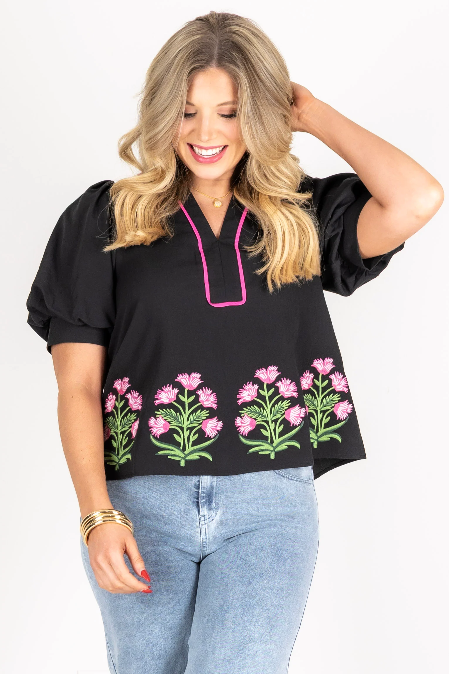 Elegant black top featuring a flattering v-neckline and short sleeves. Waist-length cut with intricate embroidered detailing adds sophistication.