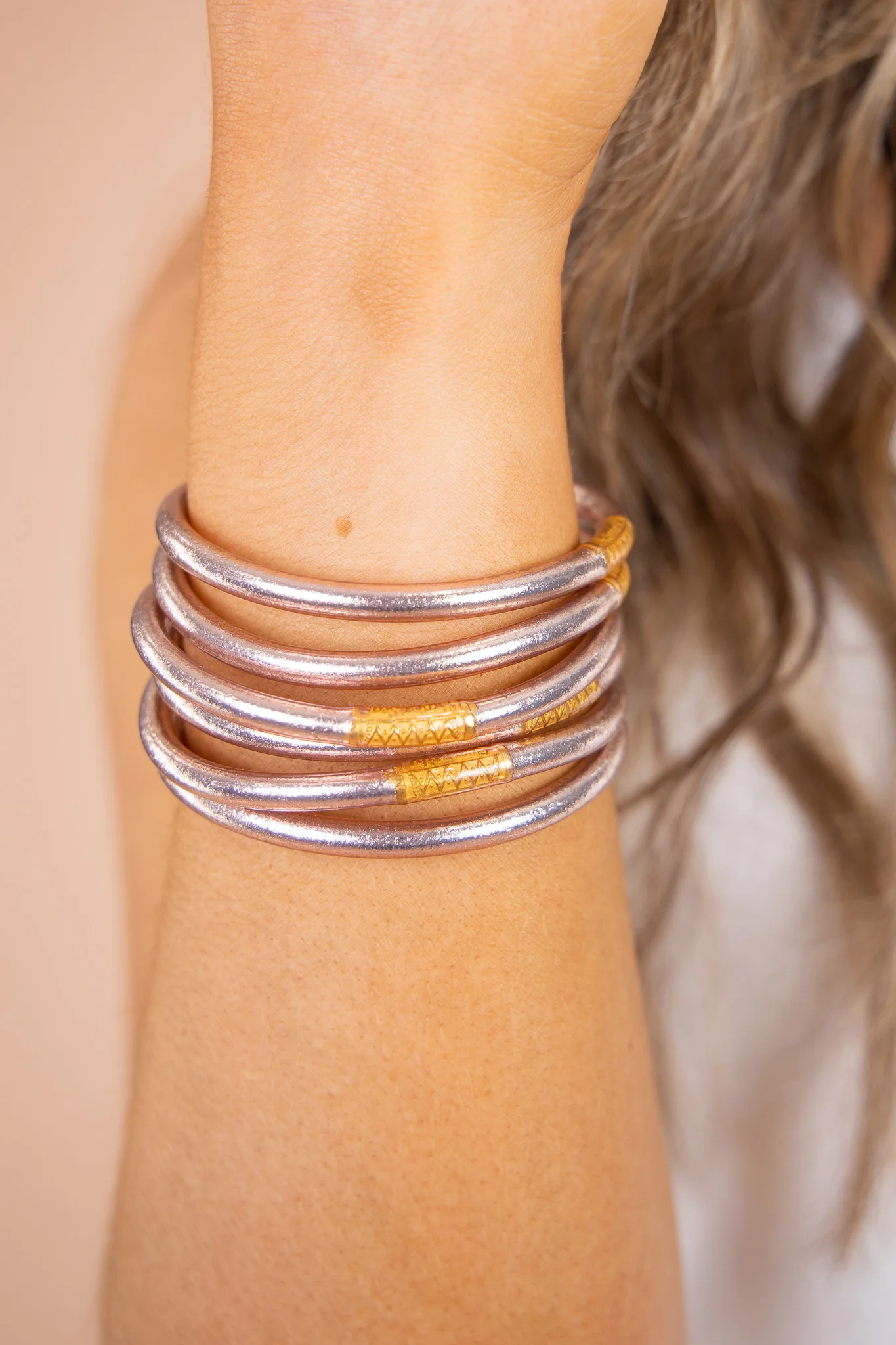 BuDhaGirl's remarkable bangles redefine elegance with their weightless, soundless, waterproof, and TSA-proof design. Crafted to perfection, each set comprises six bangles, symbolizing intentions for the day. Wear them anywhere, as their soundless and waterproof nature ensures seamless integration into any setting. Constructed from flexible polyvinyl carbonate rings infused with delicate gold leaf in a BDG tube, then sealed with the BuDhaGirl Serenity Prayer bead.