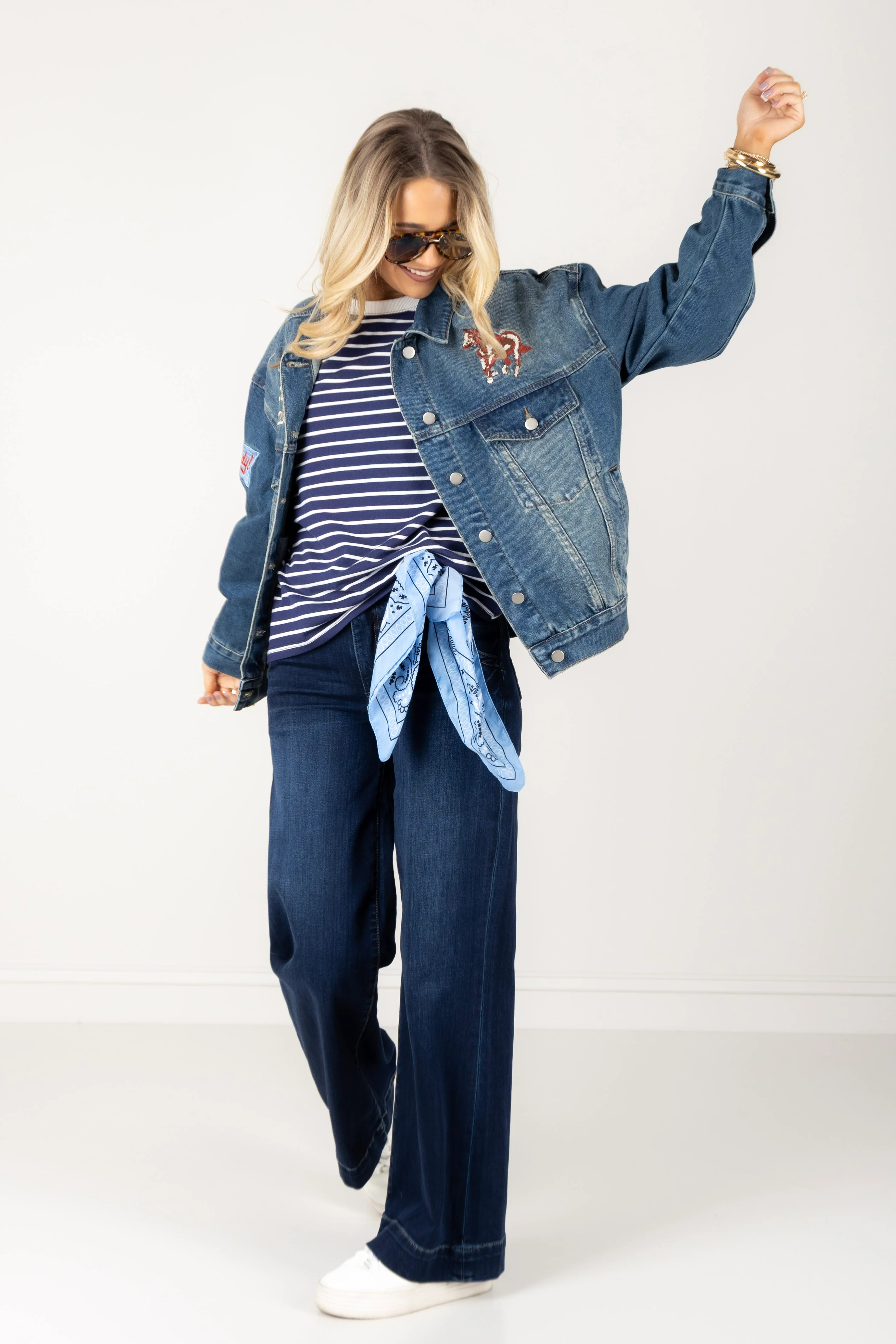 Denim jacket featuring a classic collar, functional pockets, and bold patches on both sleeves and on the back. Perfect for adding Western-inspired edge to any outfit.