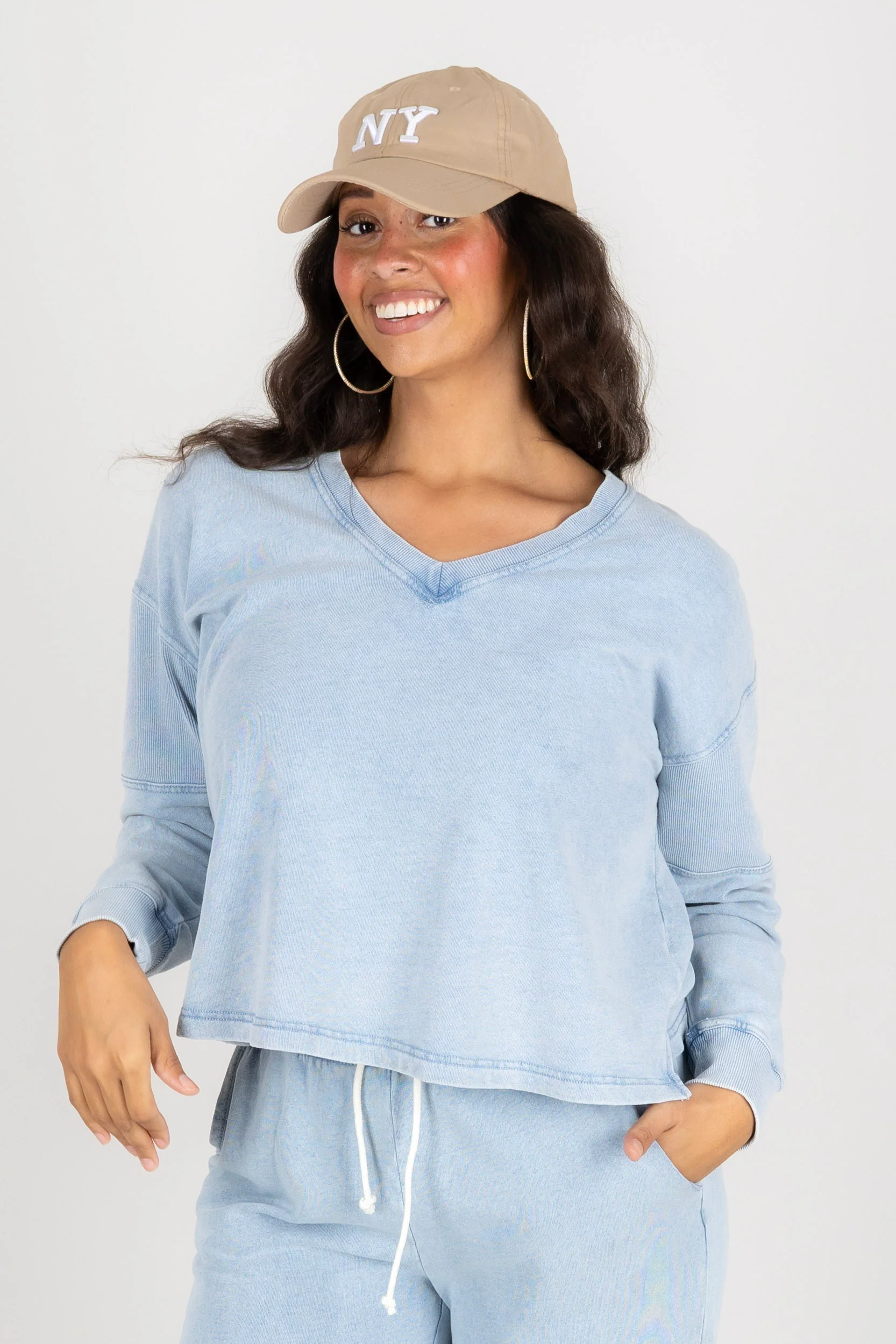 Effortless style meets comfort in this indigo denim sweatshirt. Featuring a flattering v-neckline and long sleeves, it hits at the waist for a versatile silhouette that pairs with everything.