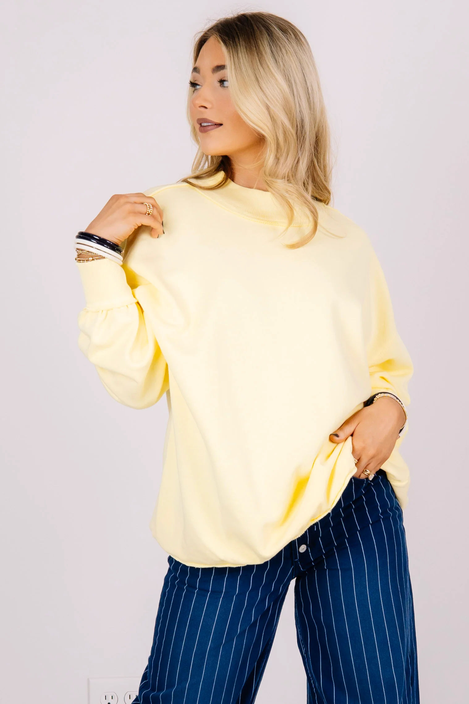 This top features a stylish mock neckline and long sleeves for a comfortable, versatile look. Its waist-length cut makes it easy to pair with various bottoms, offering both casual and polished styling options.Ā