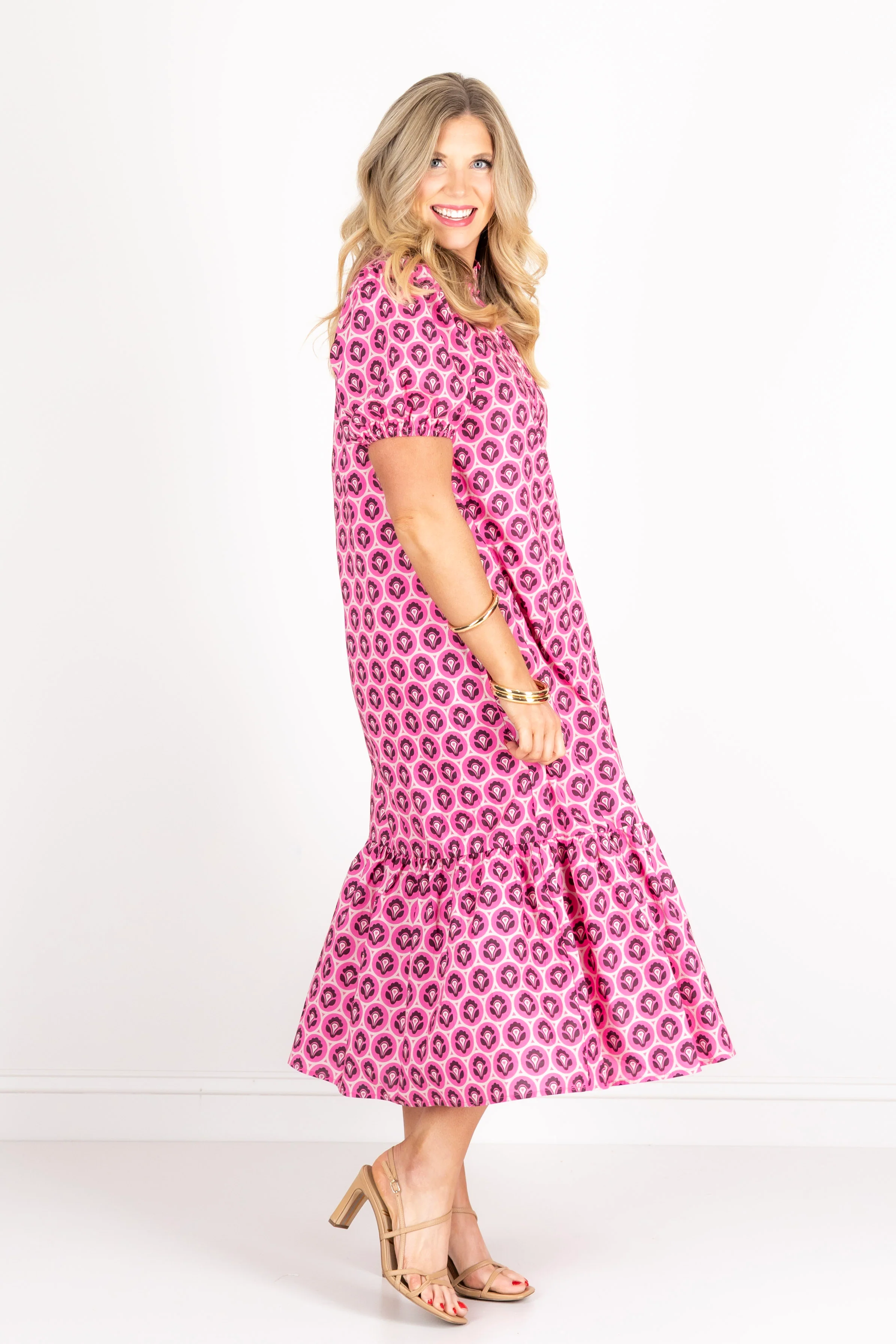 Charming pink midi dress featuring a button-down front, short sleeves, and a distinctive ruffled collar. Lined interior ensures comfort and durability throughout your day.