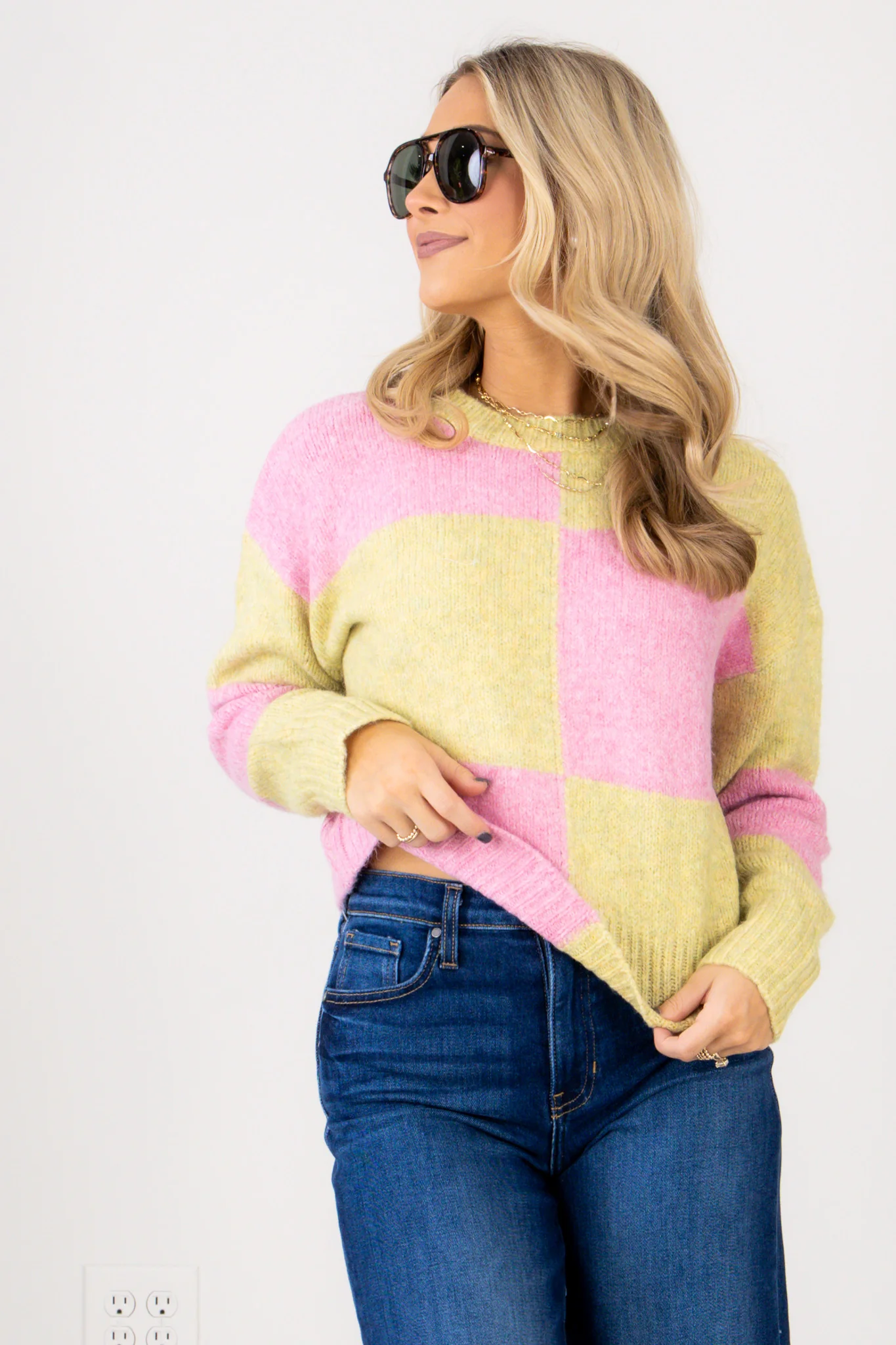 Wild and Free Yellow and Pink Checkered Long Sleeve Sweater Top